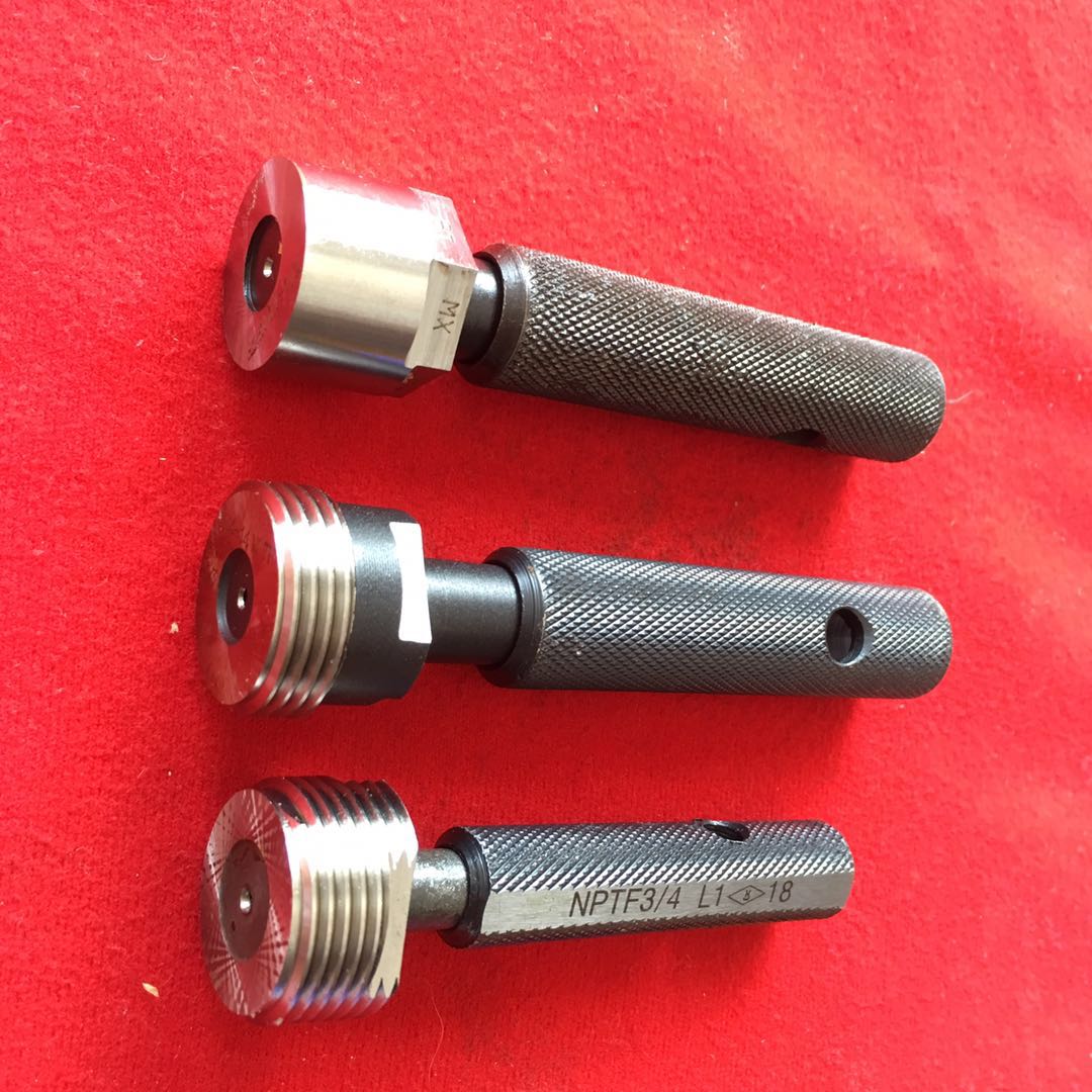 NPTF螺纹塞规属于美制圆锥管干密封螺纹量规,三件为1套:L1、L2和六台阶光面规。牙型角度:60°,锥度:1:16,执行标准:ASME B1.20.5-1991NPTF螺纹量规三件为一套:两个螺纹规和一个光面规,一般三件配套使用,亦可单件使用。