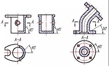 在不致引起误解时,允许将斜剖视图旋转,让主要轮廓或轴线摆正画出,此时在剖视图上方要注明相同的大写字母“A-A”,同时标注旋转方向。