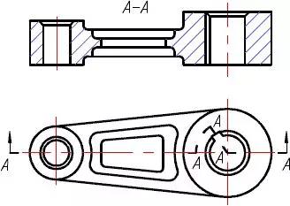 作旋转剖时,应在剖切面转折和起迄处画上剖切符号、投影方向的箭头及大写字母A,在剖视图上方注明相同的大写字母“A-A”。
