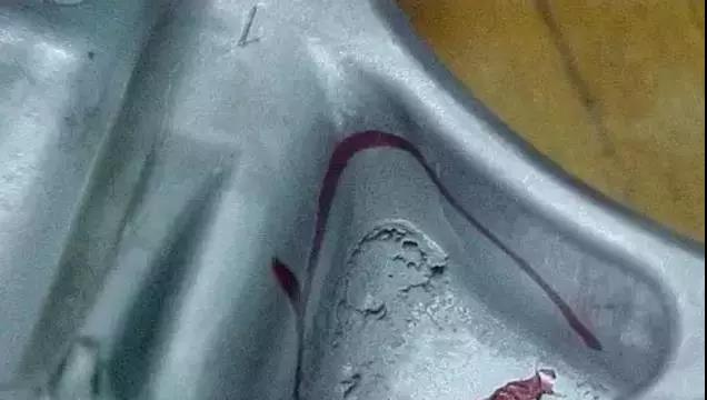 外观检查:将铸件放在碱性溶液中,裂纹处呈暗灰色。金属基体的破坏与裂开呈直线或波浪线形,纹路狭小而长,在外力作用下有发展趋势。