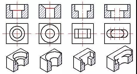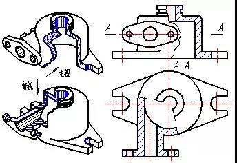 对称或基本对称的物体可以采用半剖视。如图所示,主视图通过左右对称面,把右半部作剖视;俯视图通过A-A剖切面,把前半部作剖视;左视图通过前后对称面,把前半部作剖视。