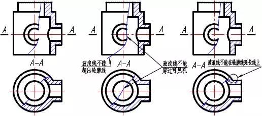 4.波浪线不应画在可见孔、通槽内或画在轮廓线外,因为这些地方不可能有断裂痕迹。